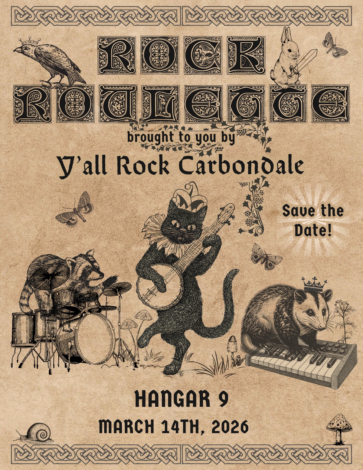 Come out to Hangar 9 on March 14th for our annual Rock Roulette fundraiser. 6 bands have set off to learn instruments, write 3 original songs, and collaborate with other community members, all while competing to raise the most money for Y’all Rock Carbondale camp and programming.